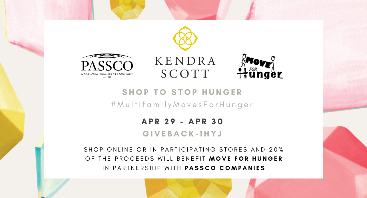“As an existing partner with Move For Hunger, we understand the need that exists throughout the nation, the need to stop hunger. This partnership between Passco, Move For Hunger and Kendra Scott evolved from an idea I had that flourished into this nationwide campaign,” Stemens says. “It is our hope that other apartment owners and managers follow suit, and roll this program out at their communities. We can all make a difference one community at a time. Let’s Shop to Stop Hunger.”